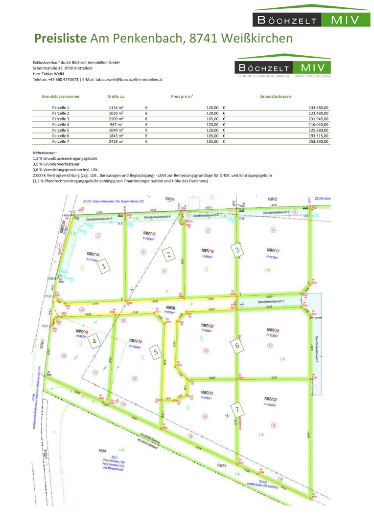 Der neu aufgeschloissene Siedlungsteil befindet sich "Am Penkenbach" in der Gemeinde Weißkirchen und bietet künftigen Eigentümern neben einer absoluten Ruhelage auch bis zu 14 Sonnenstunden in den Sommermonaten. Sämtliche Grundstücke sind als allgemeines Wohngebiet mit einer Dichte von 0,2 - 0,4 (WA 0,2 - 0,4) gewidmet, womit sich praktisch jedes Einfamilienprojekt realisieren lässt. Auch hinsichtlich der Dachformen gibt es großen Planungsspielraum für künftige Häuslbauer: Es sind Satteldächer (Neigung zwischen 30° und 45°) sowie Walmdächer (Neigung zwischen 20° und 30°) oder auch Flachdächer (Neigung bis max. 10°) zulässig. Genauere Informationen entnehmen Sie bitte dem Bebauungsplan den wir Ihnen auf Anfrage gerne zukommen lassen!