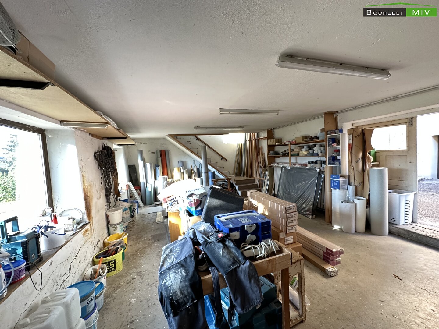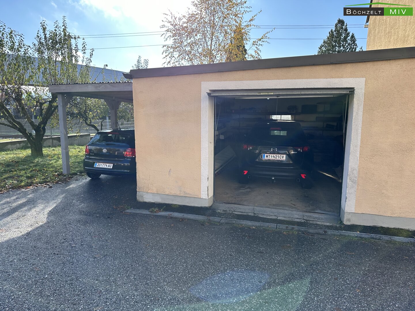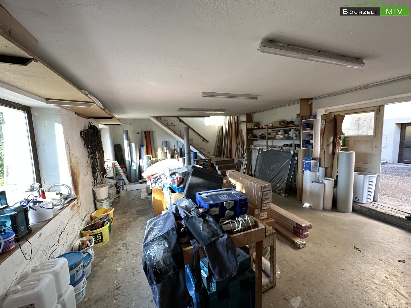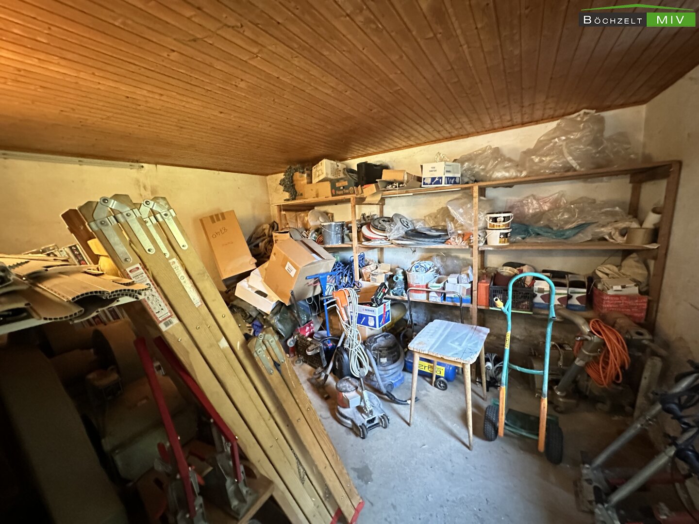Straßenseitig wurde ein Garagengebäude errichtet mit 2 Einzelgaragen. Der Zubau besteht aus Erd- und Obergeschoss. Das Erdgeschoss verfügt über ein Carport, drei Garagen, sowie einem Lagerraum und dem Hauptraum der derzeit als Werkstatt genutzt wird. Über eine Stiege erreicht man das Obergeschoss, welches wiederum aus einem großen Hauptraum besteht. Im hinteren Bereich des Obergeschosses gibt es nach einem kleinen Vorraum zwei weitere Lagerräumlichkeiten. Das Erdgeschoss des Zubaus wird von der Zentralheizung des Haupthauses mitversorgt. Im hinteren Bereich der Liegenschaft ist ein großer Garten mit einer Holz-Gartenhütte. Hier könnte der Bau von Fertigteilgaragen oder Carports angedacht werden. Nach einer groben Konzeptplanung wären hier flächentechnisch, L-förmig ca. 13 - 14 Stück Fertigteilgaragen möglich, die tatsächliche Machbarkeit muss vorab allerdings vom Käufer mit der Gemeinde abgestimmt werden (Abstandsbestimmungen zur Bahn, Grenzabstände etc.).