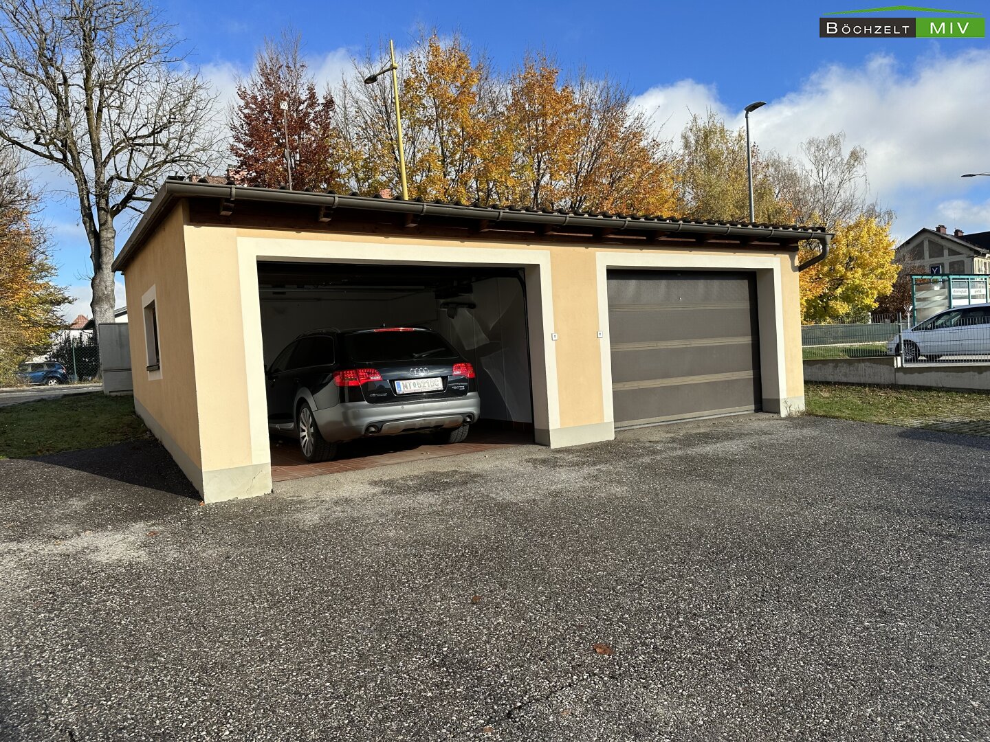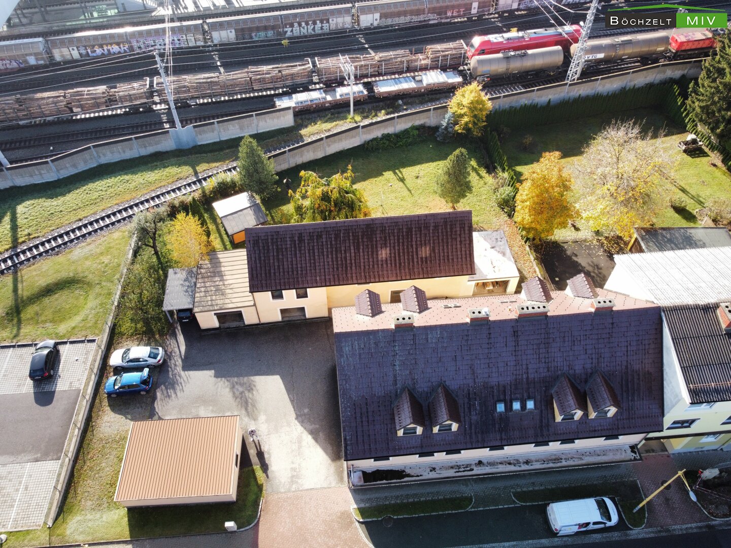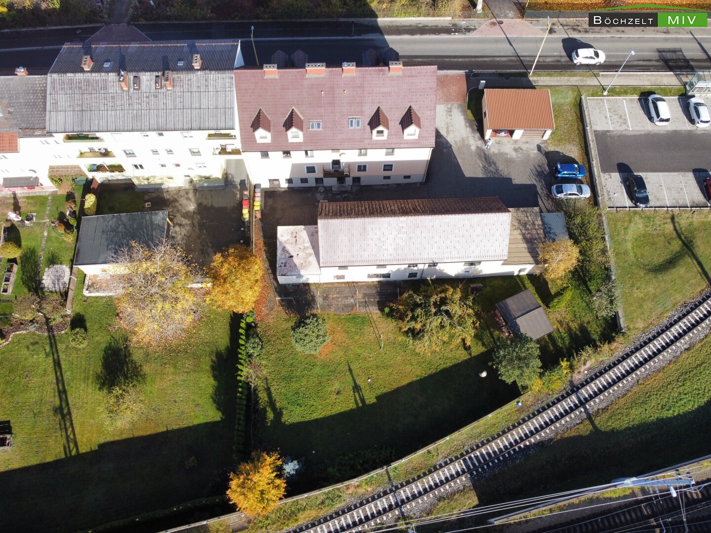 Straßenseitig wurde ein Garagengebäude errichtet mit 2 Einzelgaragen. Der Zubau besteht aus Erd- und Obergeschoss. Das Erdgeschoss verfügt über ein Carport, drei Garagen, sowie einem Lagerraum und dem Hauptraum der derzeit als Werkstatt genutzt wird. Über eine Stiege erreicht man das Obergeschoss, welches wiederum aus einem großen Hauptraum besteht. Im hinteren Bereich des Obergeschosses gibt es nach einem kleinen Vorraum zwei weitere Lagerräumlichkeiten. Das Erdgeschoss des Zubaus wird von der Zentralheizung des Haupthauses mitversorgt. Im hinteren Bereich der Liegenschaft ist ein großer Garten mit einer Holz-Gartenhütte. Hier könnte der Bau von Fertigteilgaragen oder Carports angedacht werden. Nach einer groben Konzeptplanung wären hier flächentechnisch, L-förmig ca. 13 - 14 Stück Fertigteilgaragen möglich, die tatsächliche Machbarkeit muss vorab allerdings vom Käufer mit der Gemeinde abgestimmt werden (Abstandsbestimmungen zur Bahn, Grenzabstände etc.).