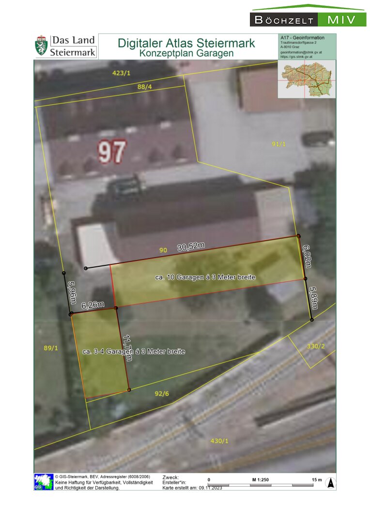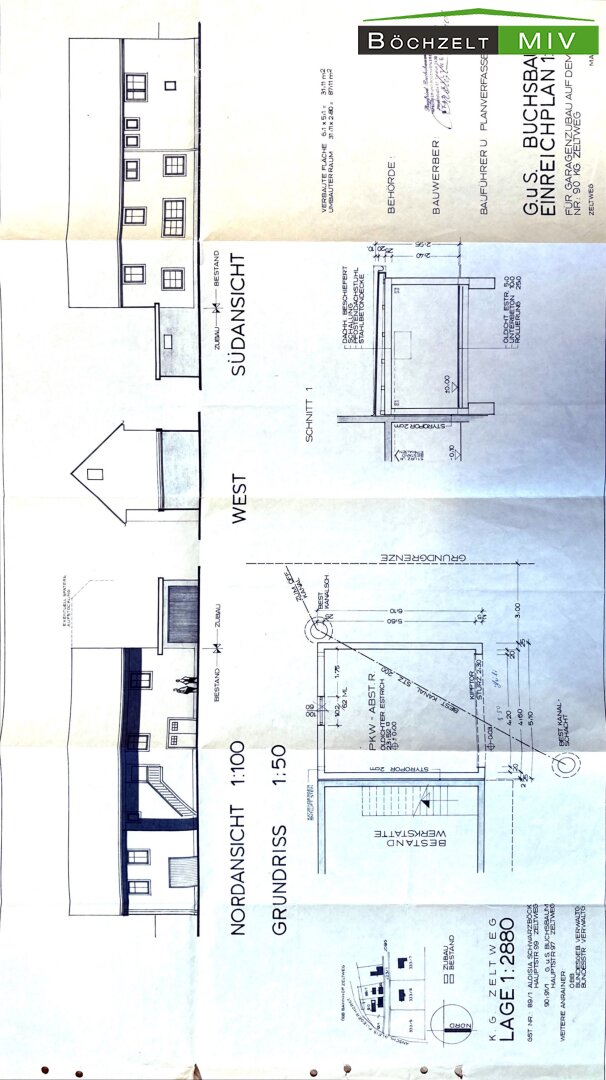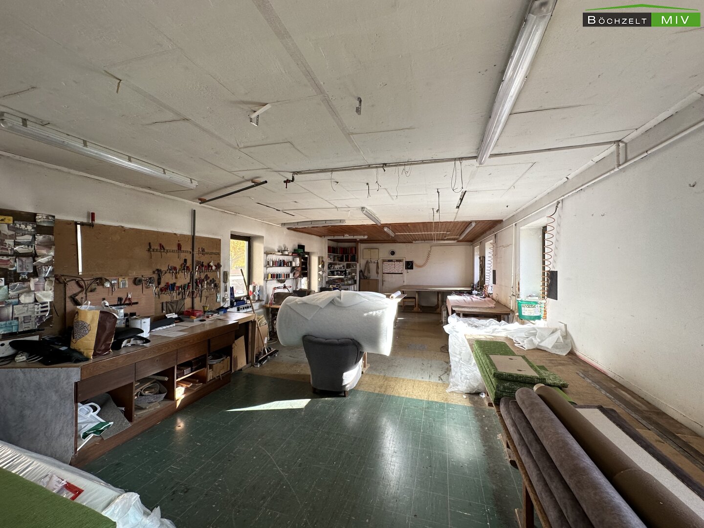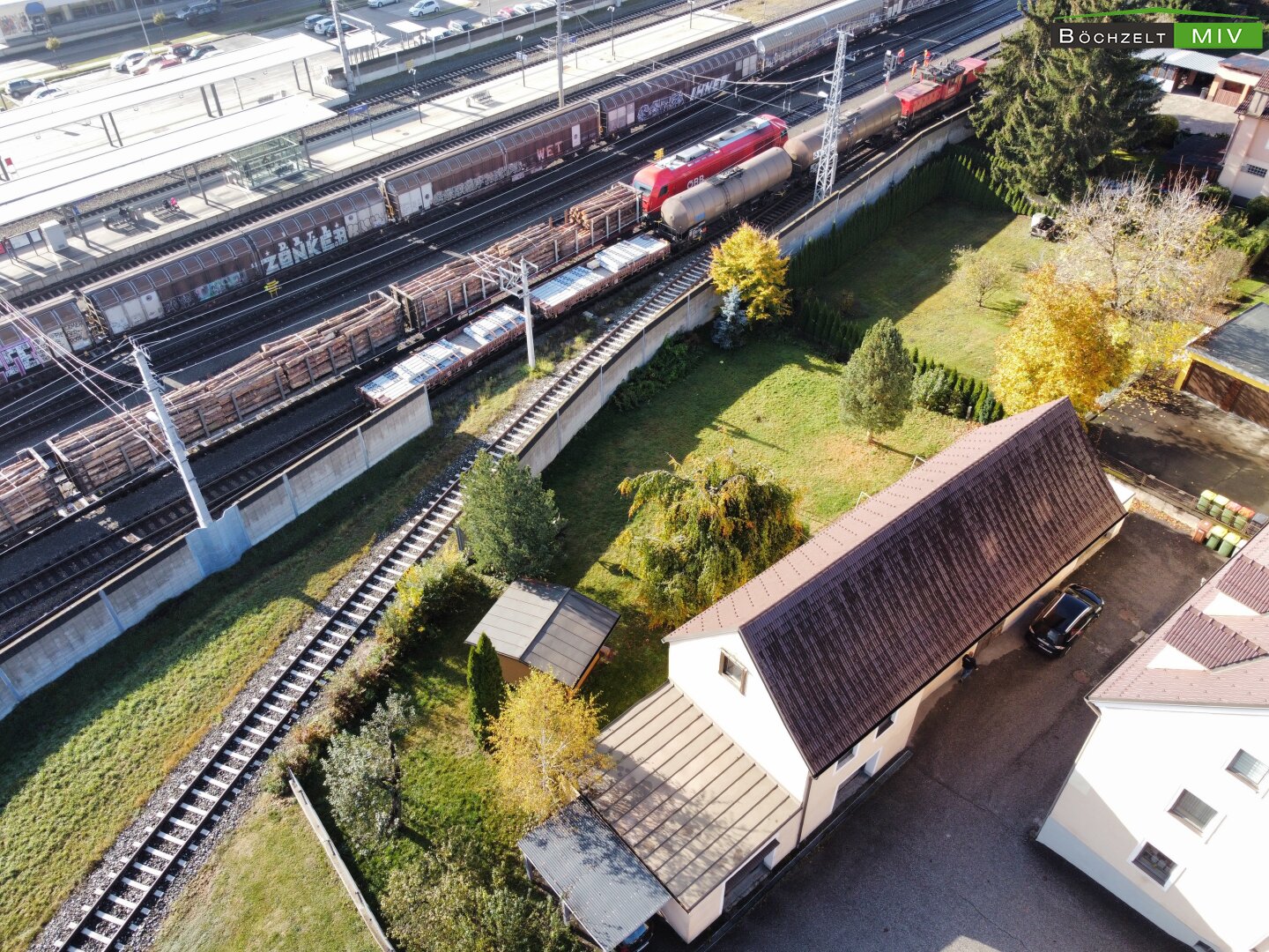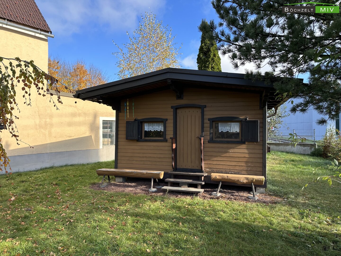 Straßenseitig wurde ein Garagengebäude errichtet mit 2 Einzelgaragen. Der Zubau besteht aus Erd- und Obergeschoss. Das Erdgeschoss verfügt über ein Carport, drei Garagen, sowie einem Lagerraum und dem Hauptraum der derzeit als Werkstatt genutzt wird. Über eine Stiege erreicht man das Obergeschoss, welches wiederum aus einem großen Hauptraum besteht. Im hinteren Bereich des Obergeschosses gibt es nach einem kleinen Vorraum zwei weitere Lagerräumlichkeiten. Das Erdgeschoss des Zubaus wird von der Zentralheizung des Haupthauses mitversorgt. Im hinteren Bereich der Liegenschaft ist ein großer Garten mit einer Holz-Gartenhütte. Hier könnte der Bau von Fertigteilgaragen oder Carports angedacht werden. Nach einer groben Konzeptplanung wären hier flächentechnisch, L-förmig ca. 13 - 14 Stück Fertigteilgaragen möglich, die tatsächliche Machbarkeit muss vorab allerdings vom Käufer mit der Gemeinde abgestimmt werden (Abstandsbestimmungen zur Bahn, Grenzabstände etc.).
