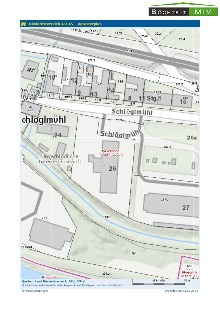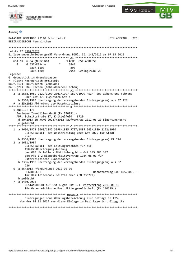 Die Gesamtnutzfläche verteilt sich auf das Hauptgebäude mit Hallenflächen im Ausmaß von ca. 451,42 m² (Zustellerbereich, Vorsortierung und Windfang), sowie dem Bürobereich, bestehend aus Büroräumlichkeiten, Sozialraum, Lagern, Technikraum, Garderoben, Vorraum und WC-Anlagen. Zudem besteht noch ein Nebengebäude, welches derzeit als Lagerraum genutzt wurde im Ausmaß von ca. 27 m². Das Nebengebäude ist mit dem Hauptgebäude über ein Flugdach verbunden. Die Grundstücksfläche liegt lt. Internetauskunft des GIS Niederösterreich im Kerngebiet, ein Teil des Grundstückes (Parkplätze) liegt in der gelben Zone. Die Zufahrt erfolgt über ein grundbücherlich gesichertes Servitut am Grundstück 373 der KG 23140 Schmidsdorf.