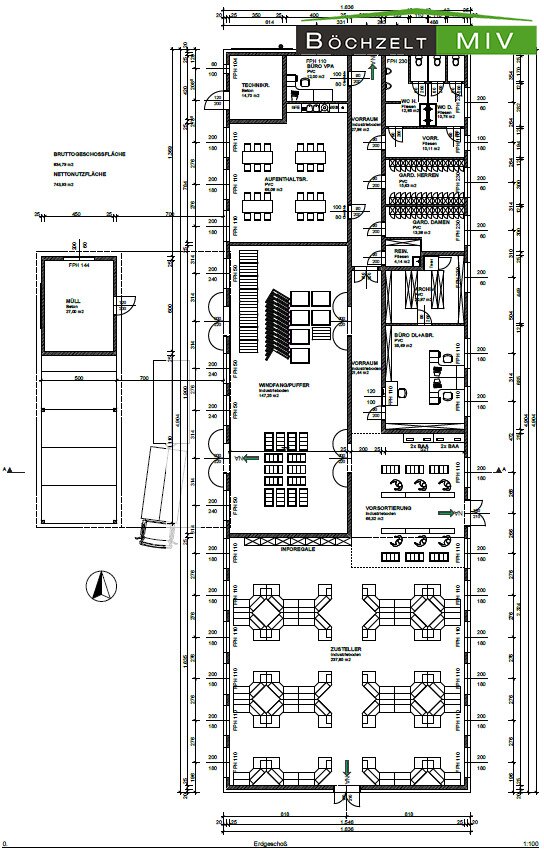 - Hallenflächen, Büros, Aufenthaltsraum, Garderoben, Herren- und Damen-WC, Abstellräume etc.