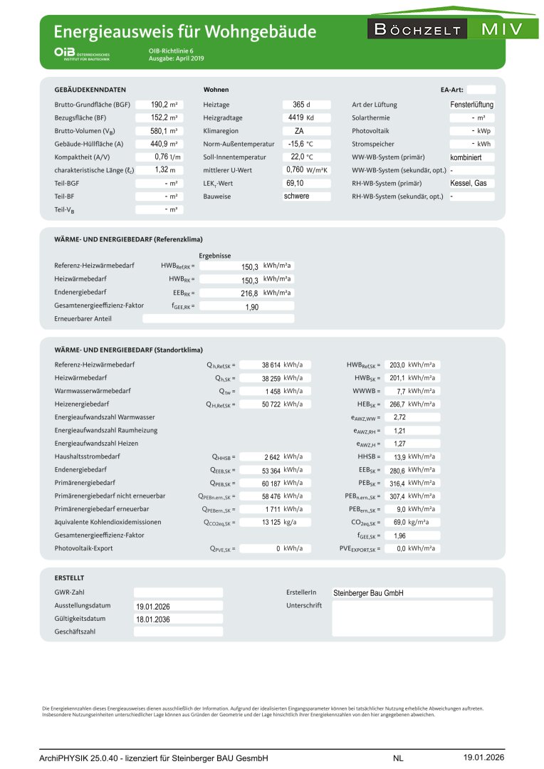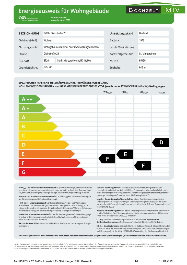 Das Wohngebäude wurde zwischen 2023 und 2025 umfassend saniert: Dabei wurde die gesamte Elektrik des Hauses erneuert, beide Badezimmer samt WC entkernt und saniert, Bodenbeläge im Haus ausgetauscht, die Innenstiegen saniert und neu verfliest, die Liegenschaft innen komplett neu gespachtelt und gemalen, teilweise neue Leitungen verlegt (Leitungen in den Bädern komplett neu, Steigleitungen tw. ausgetauscht sowie neue Elektroleitungen), sowie Innentüren saniert. Überdies wurden im gesamten Haus neue 3-fach-verglaste Kunststoffenster in anthrazit samt gedämmter Rollläden montiert. Im Objekt sind Fliesen-, Vinyl-, Laminat- und Parkettböden verlegt. Im Kellergeschoss finden sich größtenteils Betonböden wieder. Die Liegenschaft wird mit Gas beheizt, die Therme wurde ca. 2004 getauscht. Für die Warmwasseraufbereitung ist ein an das Heizsystem angeschlossener Boiler vorhanden. Die befestigten Außenanlagen sind geschottert. Die Gartenflächen bieten überdies noch genügend Platz für weitere Ideen, wie z. B. die Errichtung eines Pooles, eines Wintergartens oder ähnlichem. Auch ein gemütlicher Pavillion steht Ihnen zur Verfügung. Das Objekt ist sofort bezugsfertig!