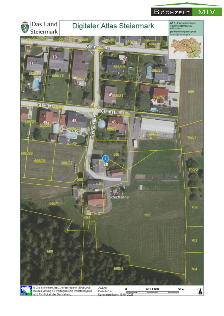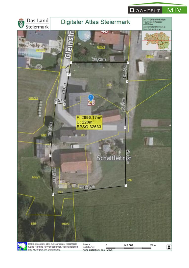Die knapp 2.700 m² große Liegenschaft liegt zur Gänze im Freiland, ist allerdings an die öffentlichen Versorgungsträger angeschlossen (Wasser, Kanal, Strom, Gas). Bei Bedarf können noch weitere angrenzende Grünlandflächen (ca. 6.500 m²) bzw. ein knapp 300 m² großes Gewächshaus dazu gepachtet werden. Der Verkauf ist gemäß § 6 Abs 2 Z 7 Steiermärkisches Grundverkehrsgesetz vom Grundverkehrsgesetz ausgenommen, weshalb auch Nicht-Landwirte diese Liegenschaft erwerben können.