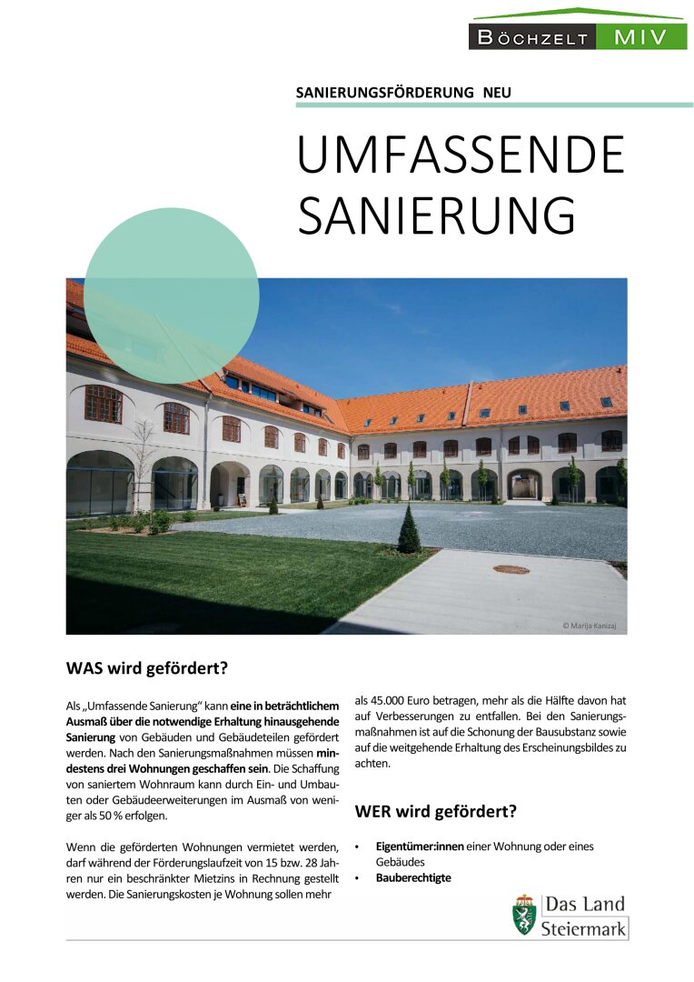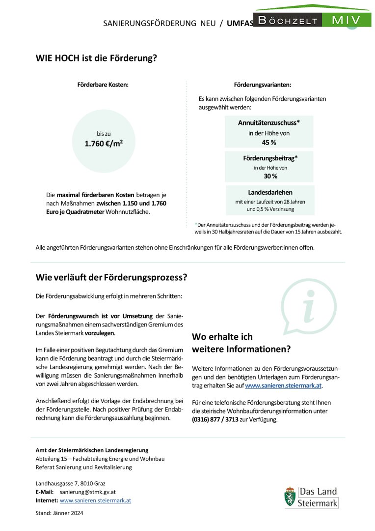 Aufgrund des Baujahres und des Erhaltungszustandes des Objektes würde sich auch die Sanierung unter Inanspruchnahme einer Wohnbauförderung anbieten. Mit der umfassenden Sanierung des Landes Steiermark werden 45% nicht rückzahlbare Annuitätenzuschüsse für die Sanierung gewährt. Zudem kommen Sie in den steuerlichen Genuss der 15tel Abschreibung und damit zur Reduktion Ihrer persönlichen Einkommenssteuerlast. Nähere Informationen zur umfassenden Sanierung finden Sie hier.