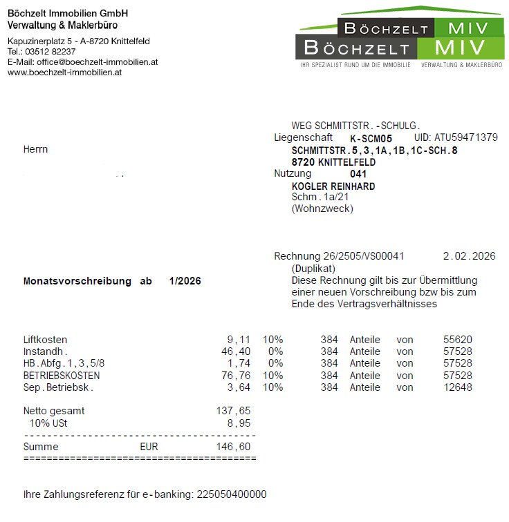 Die Beheizung der Wohnung erfolgt derzeit über elektrische Nachtspeicheröfen. Im Schlafzimmer und in der Wohnküche besteht allerdings auch die Möglichkeit, einen Ofen beim bestehenden Kamin zu installieren. Auch an die bestehende Fernwärmeleitung im Keller könnte man die Wohnung über einen Kamin anschließen. Die monatliche Vorschreibung der Hausverwaltung beläuft sich auf derzeit 146,60 € inkl. Betriebs-, Verwaltungskosten und Rücklage. Die Instandhaltungsrücklage für die Gesamtliegenschaft weist per Ende Dezember 2025 ein Guthaben von ca. 387.159,22 € auf. Derzeit sind die bauliche Umgestaltung des Innenhofes um mehr Parkfläche zu schaffen, sowie die Sanierung einiger Loggien geplant, die Kosten dafür sind aus den Rücklagen gedeckt. Die Fenster im Wohn- und Schlafzimmer wären auf eigene Kosten des Käufers zu tauschen.