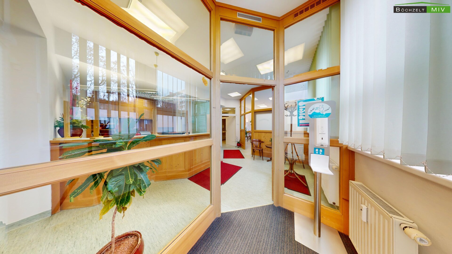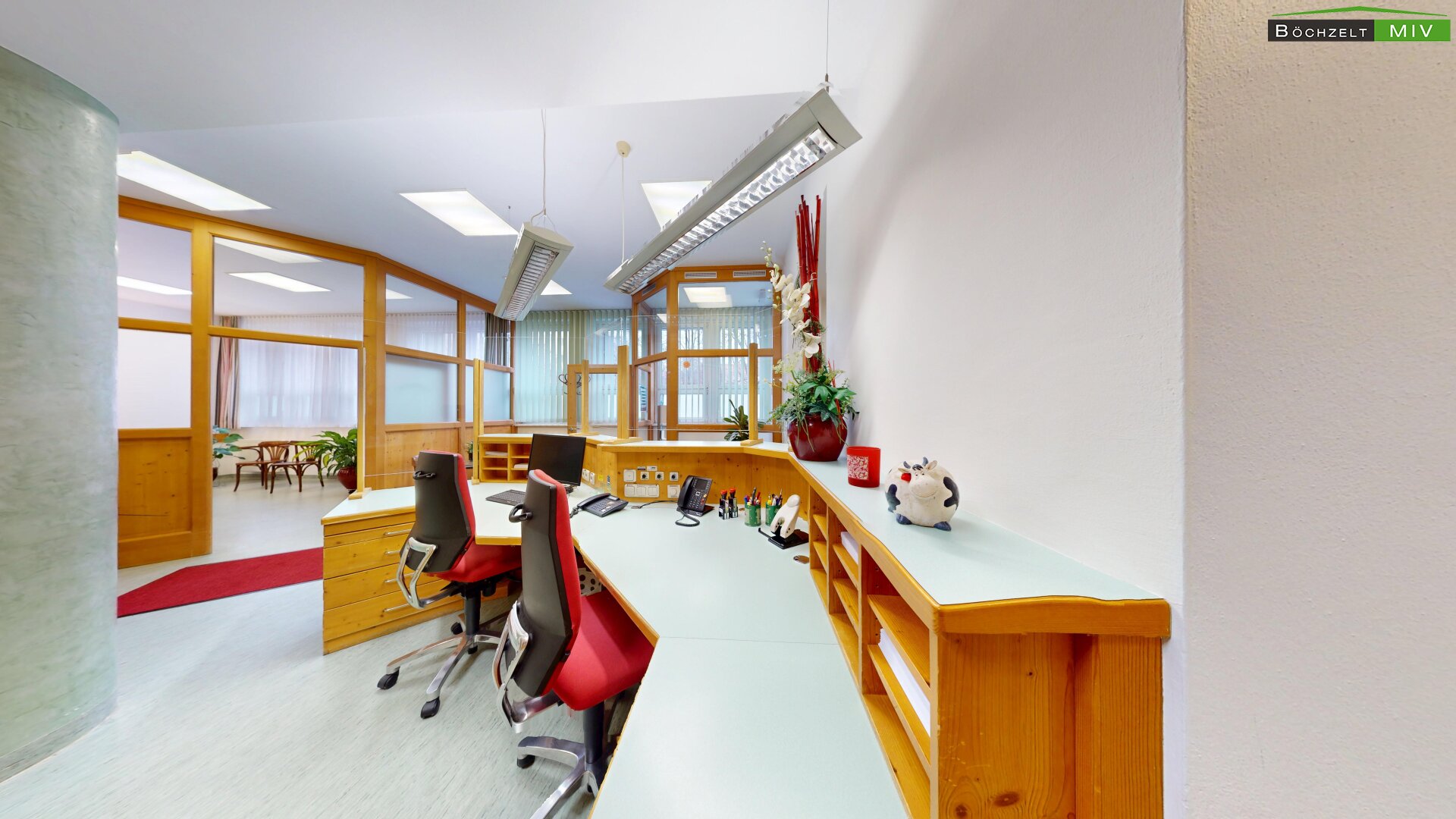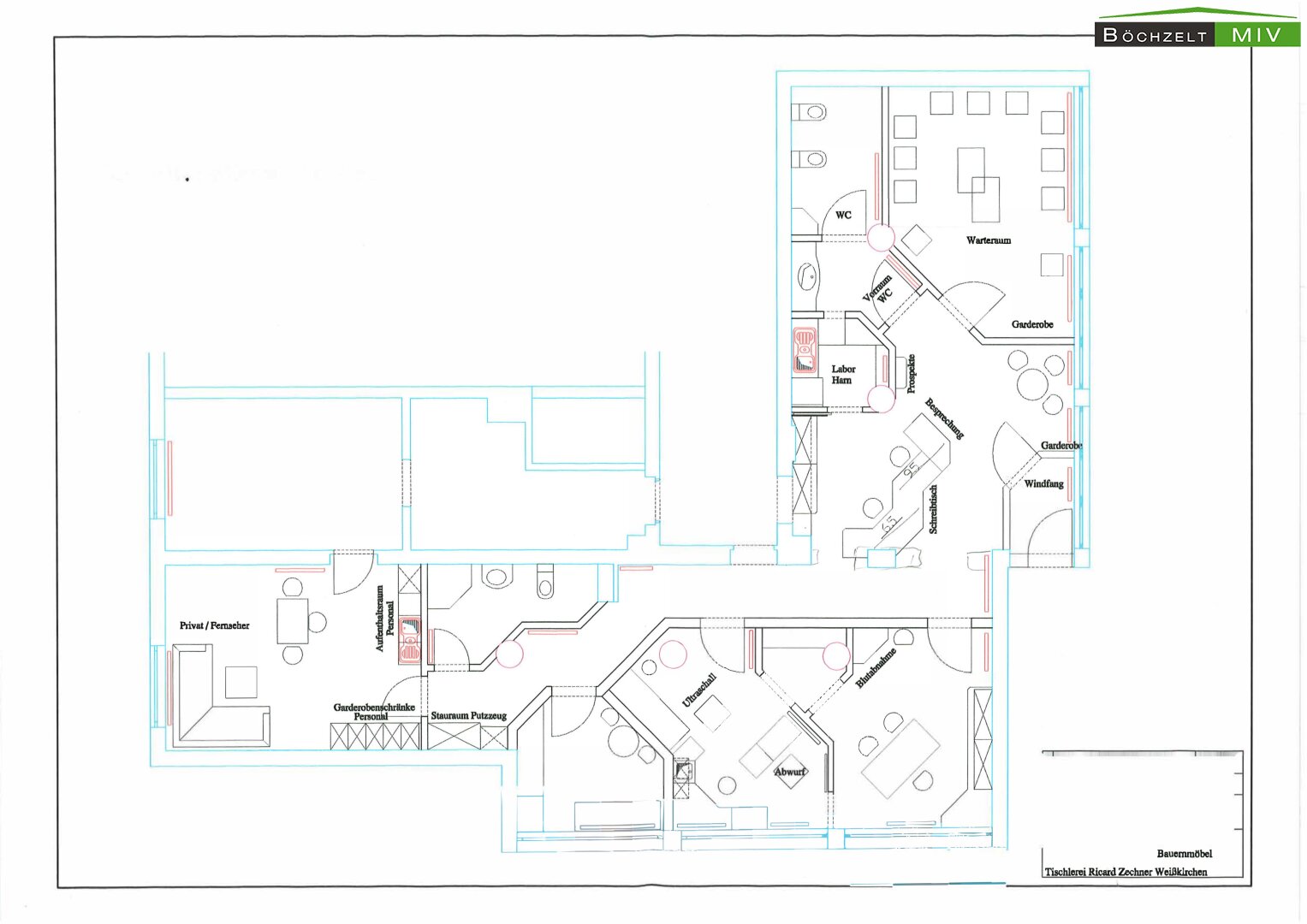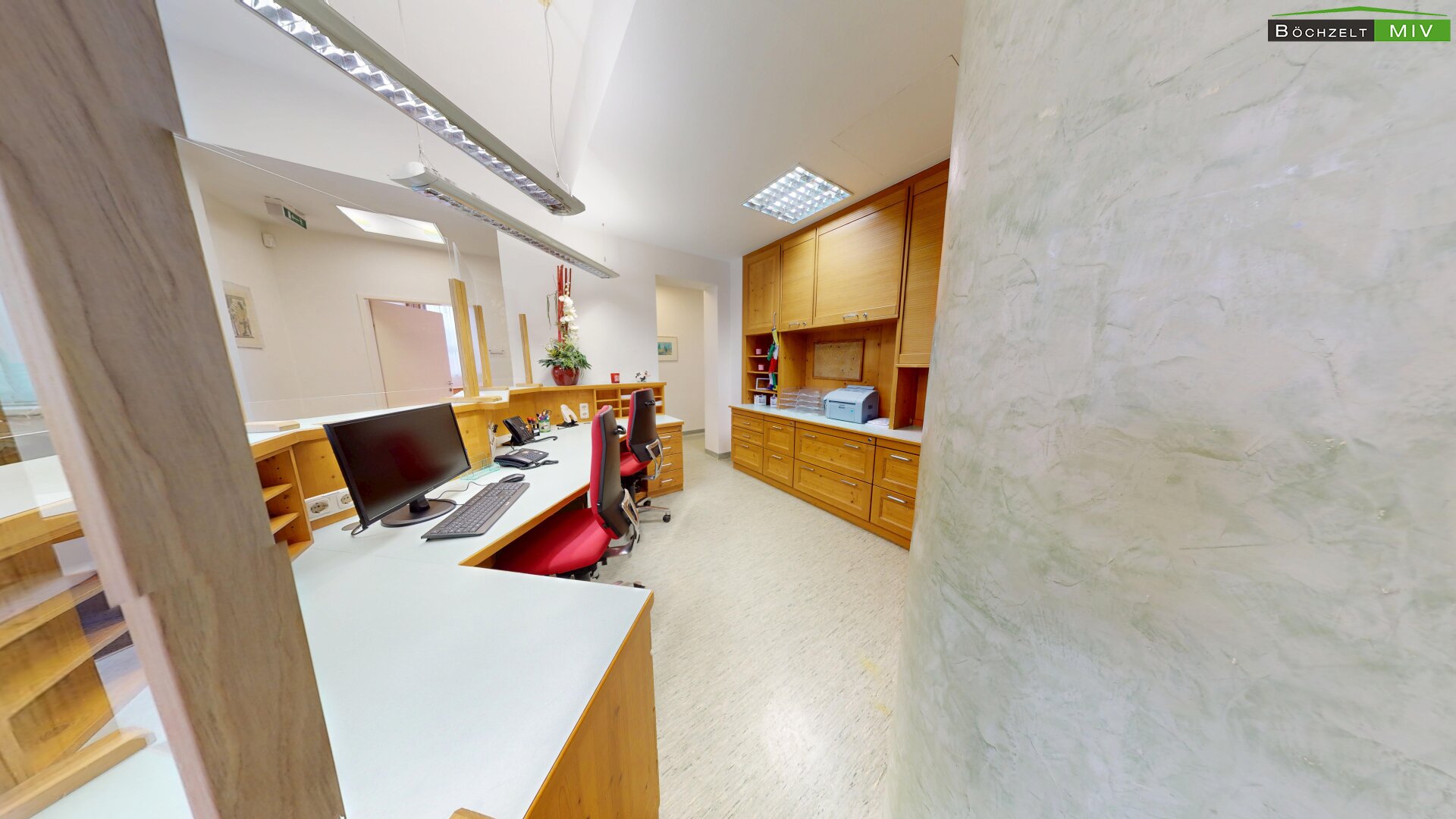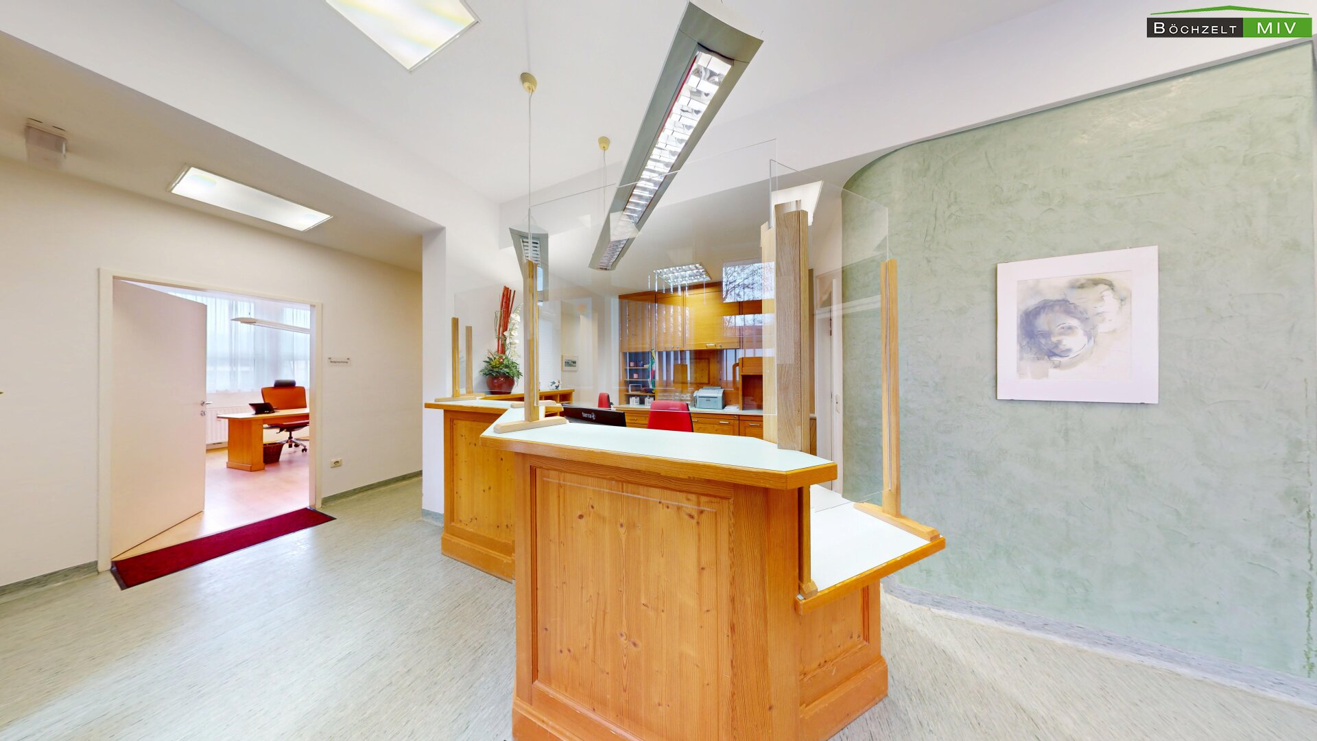 - Empfang, Wartebereich, 3 Büros, 2 WC bzw. Bad, Lagerräume und Aufenthaltsraum