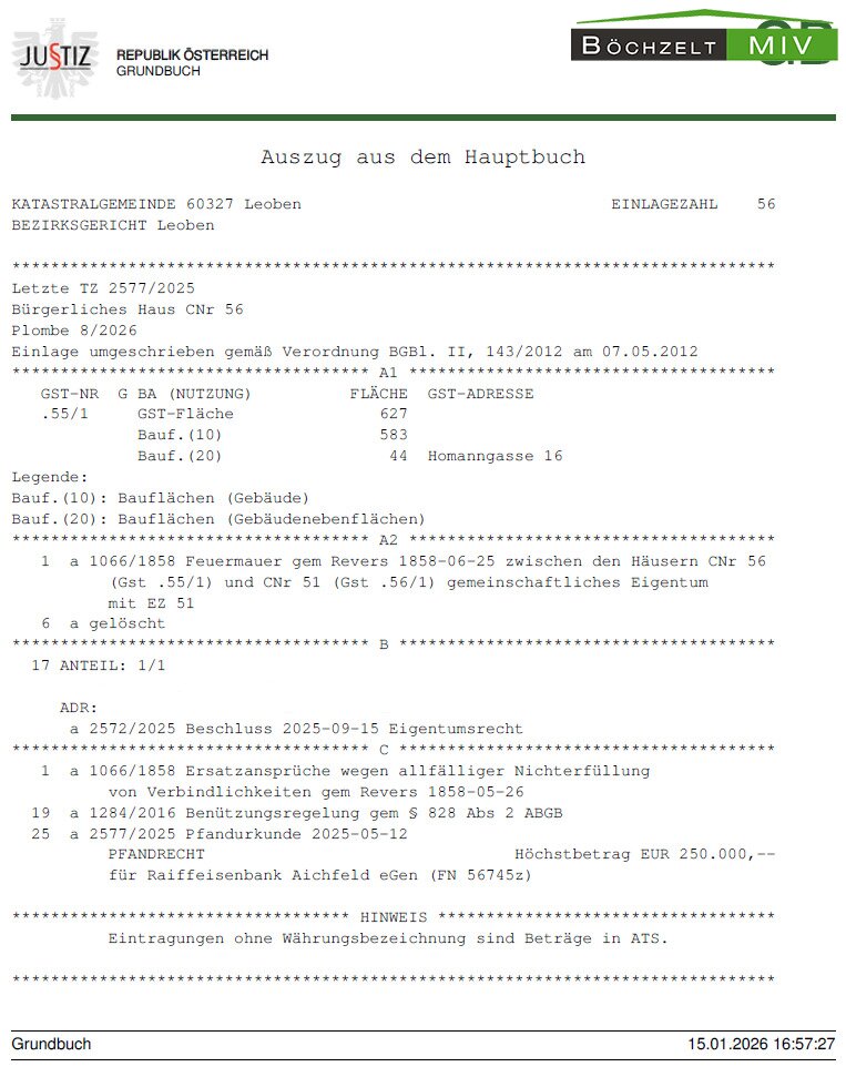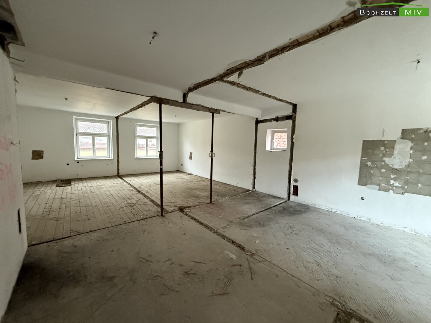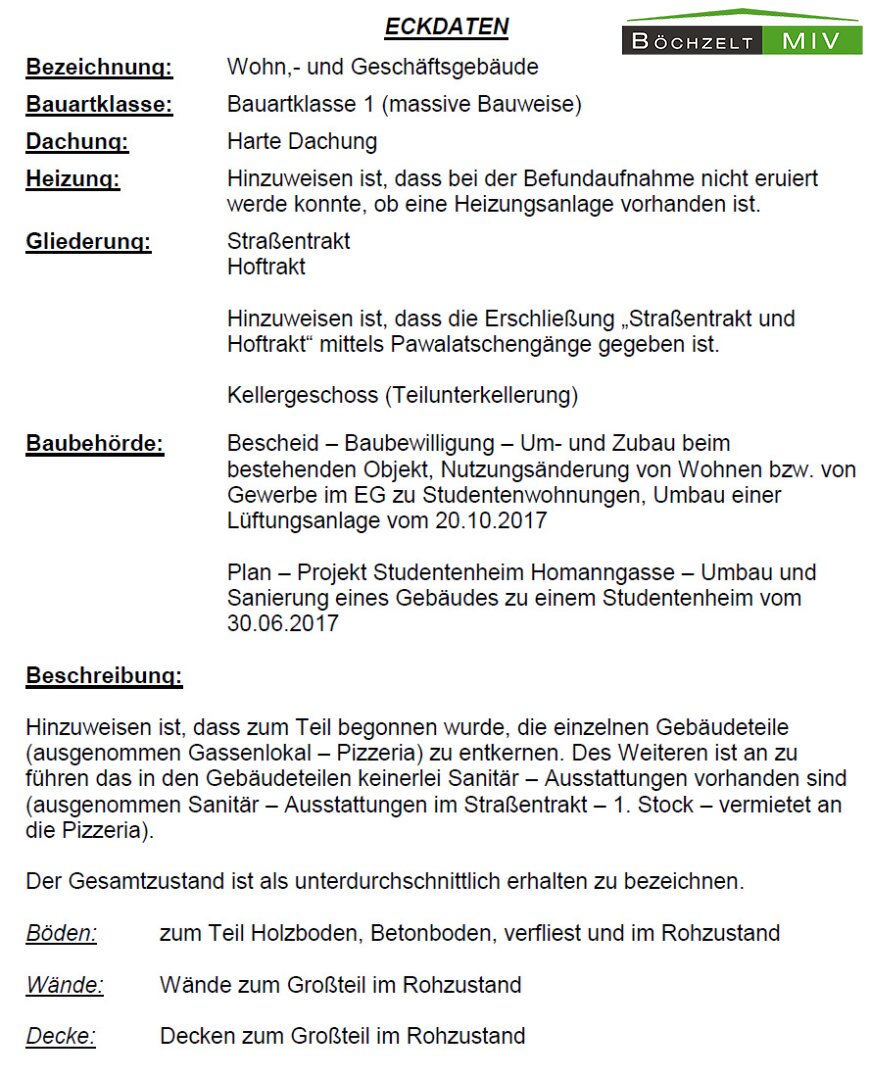 Zum Verkauf steht ein aus- und umbaufähiges Wohn- und Geschäftshaus in der Homanngasse in Leoben. Mit den nötigen Ausbaumaßnahmen können dabei moderne Wohnflächen (teilweise mit Penthouse) in bester Leobner Lage errichtet werden. Die oberirdischen Geschosse (derzeit EG, OG, DG) sind komplett entkernt, im 2. DG gibt es überdies noch Ausbaupotential, woraus sich eine Gesamtbruttogeschossfläche nach den Umbaumaßnahmen bzw. nach dem Dachgeschossausbau von ungefähr 1.765 m² oberirdisch ergibt. Das Objekt ist zudem teilunterkellert (ca. 118 m² Bruttogeschossfläche). Die oberirdisch erzielbare Bruttogeschossfläche entspricht in etwa einer Nutzfläche von 1.250 - 1.300 m². Lt. Aufmaß des Sachverständigen wird derzeit von einer Nutzfläche von ca. 850 m² ausgegangen (ohne Potentialflächen in den Dachgeschossen).