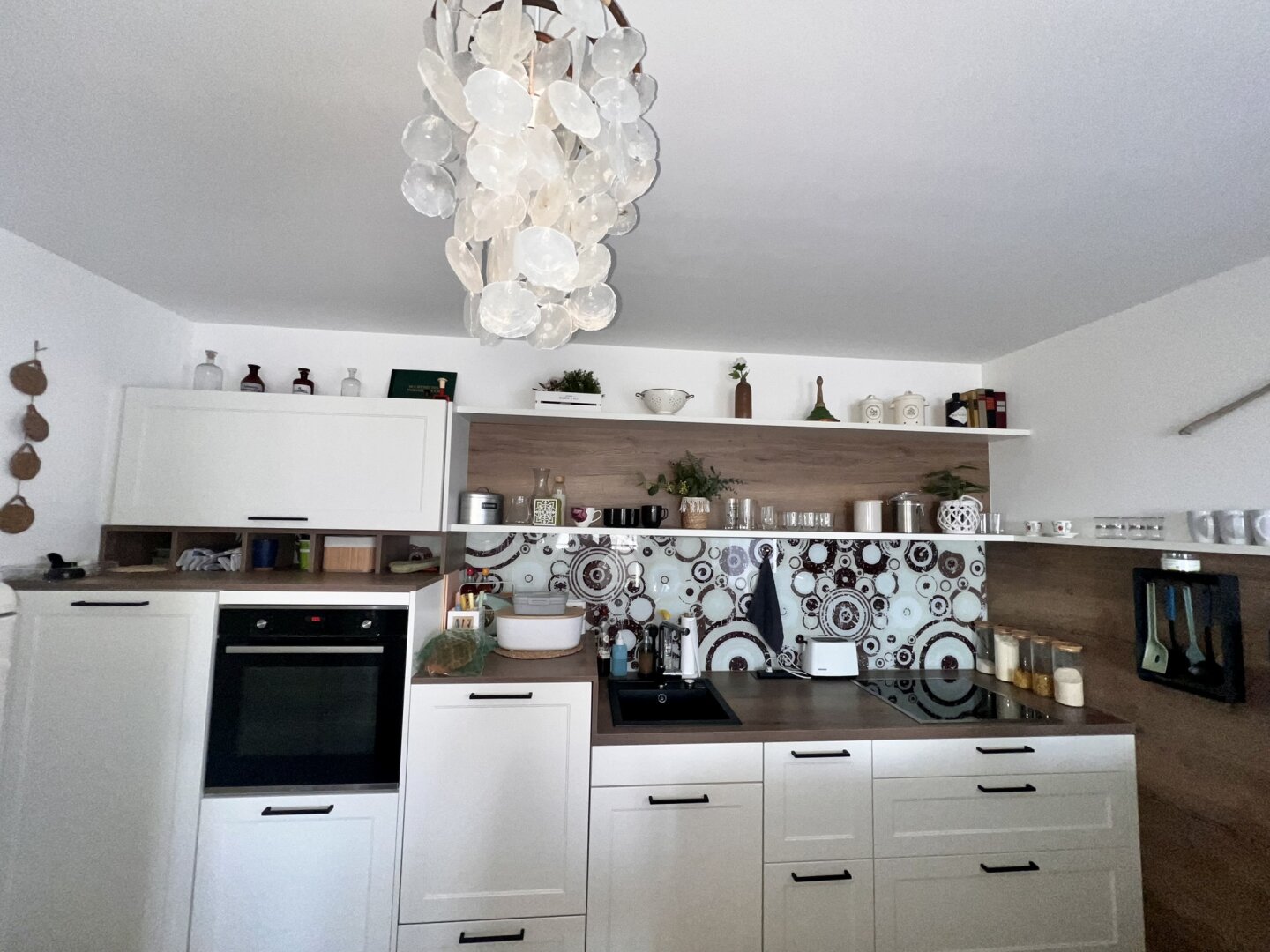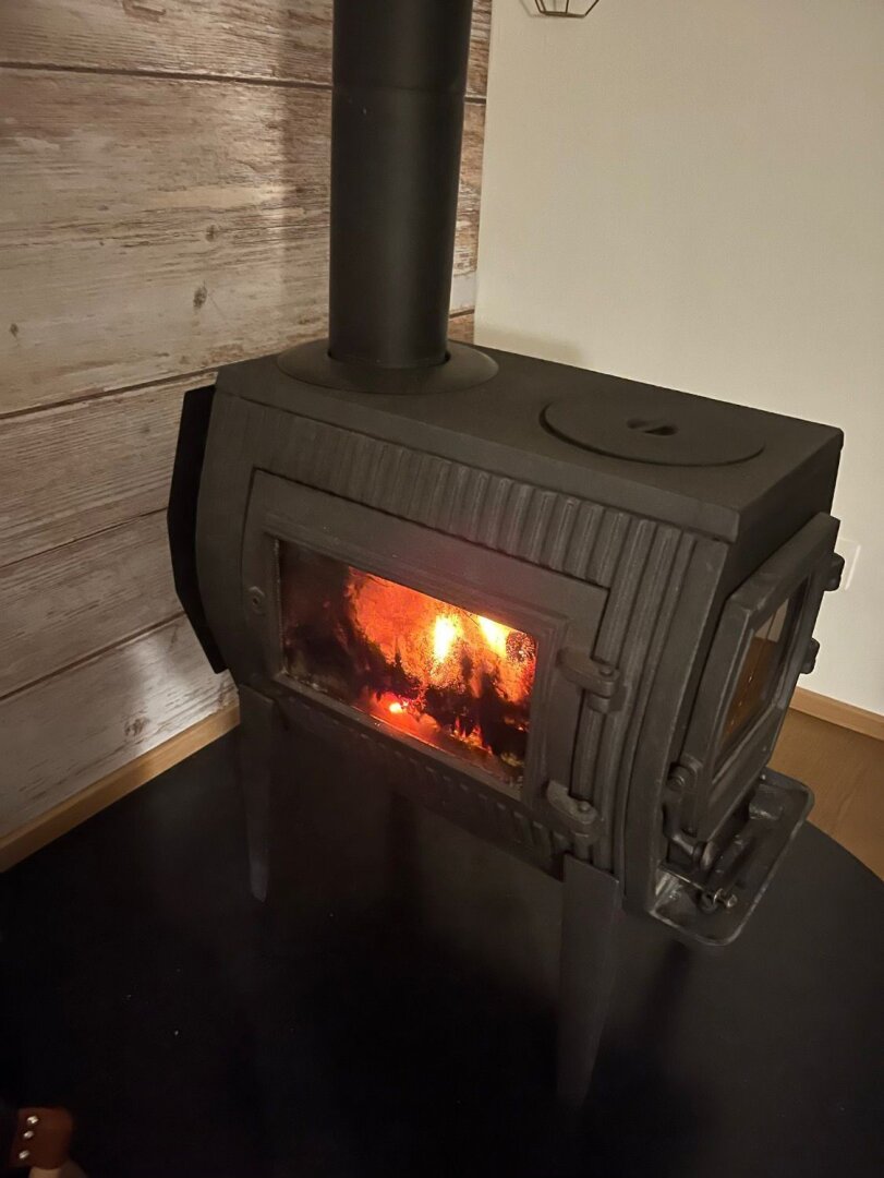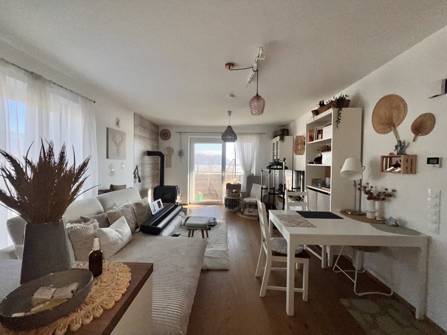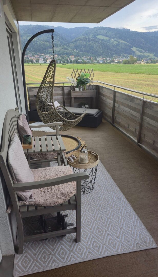 Der großzügige Wohnbereich bietet viel Platz zum Leben und Entspannen. Ein zusätzlicher Ofen für feste Brennstoffe schafft in der kälteren Jahreszeit eine behagliche Atmosphäre. Die Küche ist modern und praktisch ausgestattet und harmonisch in den Wohnraum integriert. Vom Balkon aus genießen Sie einen freien Blick ins Grüne und auf die umliegende Landschaft.